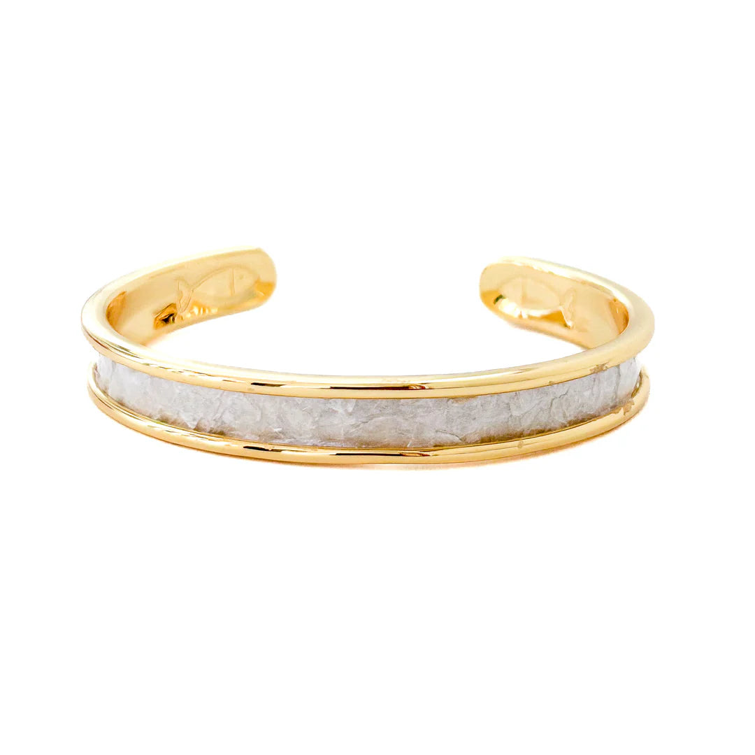 A signature BOATEAK favorite. This custom bangle features a shimmering inlay of Phillip Jeffries pearlized shell wallpaper, giving it a luminous, ocean-inspired glow. The perfect blend of craftsmanship and coastal luxury, it’s a standout piece worn alone or stacked.