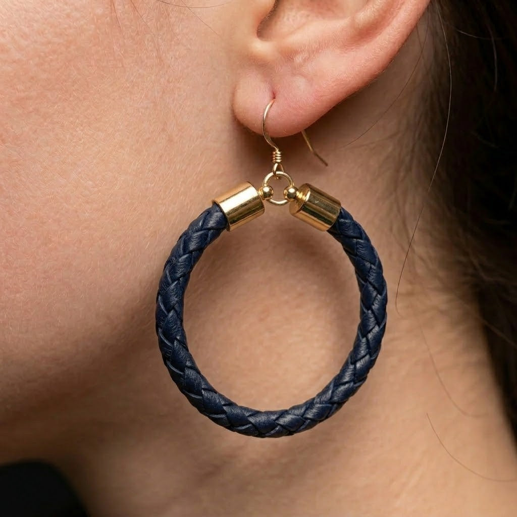 Designed with a beautifully braided leather detail in a deep navy blue, these lightweight hoops bring natural texture and understated elegance to any look. Effortlessly versatile, they transition seamlessly from relaxed daytime wear to more polished occasions.