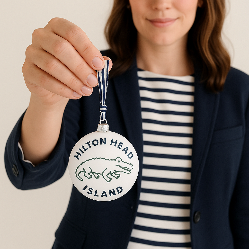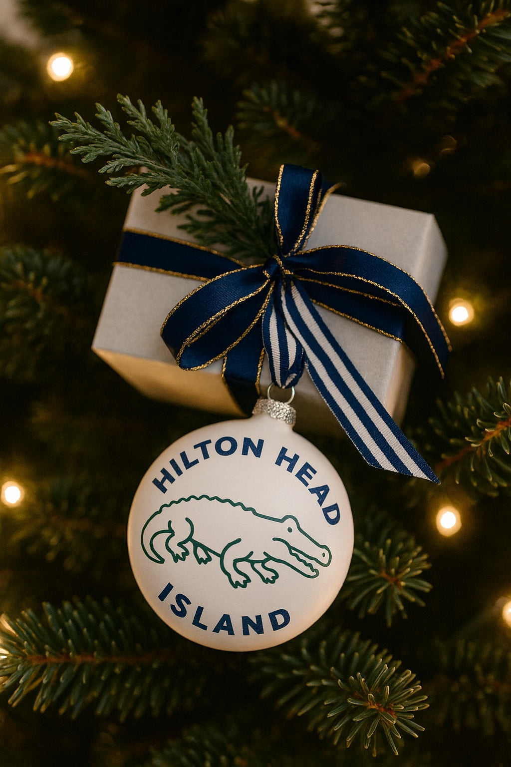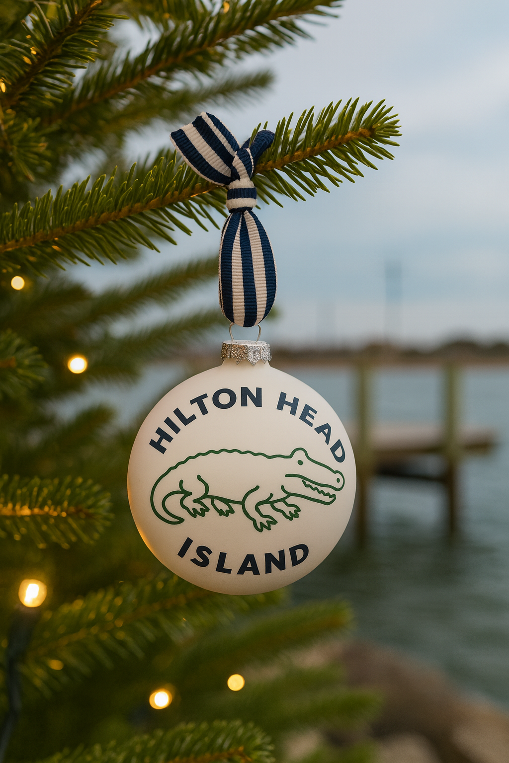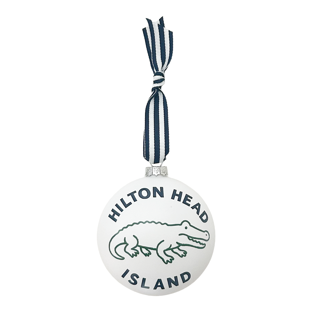 Bring a bit of Lowcountry cheer to any tree with this flattened alligator ornament, a Lissy original design inspired by coastal Hilton Head living. Finished with a navy and white ribbon hanger, it makes a thoughtful housewarming gift or ideal for holiday gifting!