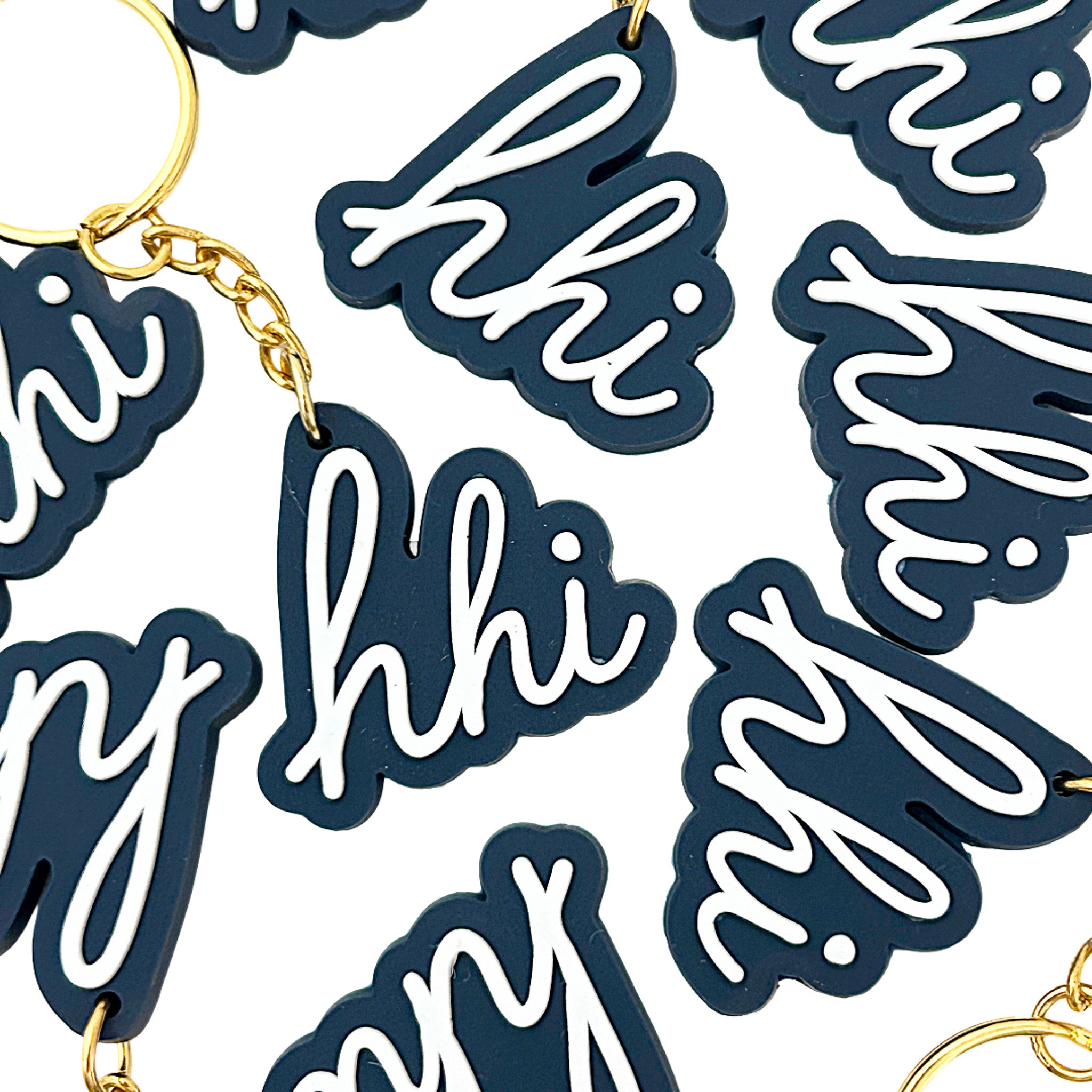 A classic coastal accessory featuring a navy and white acrylic “HHI” charm paired with a gold chain. Inspired by seaside style, this keychain blends classic nautical tones with modern sophistication — perfect for adding a hint of Lowcountry charm to your everyday essentials.