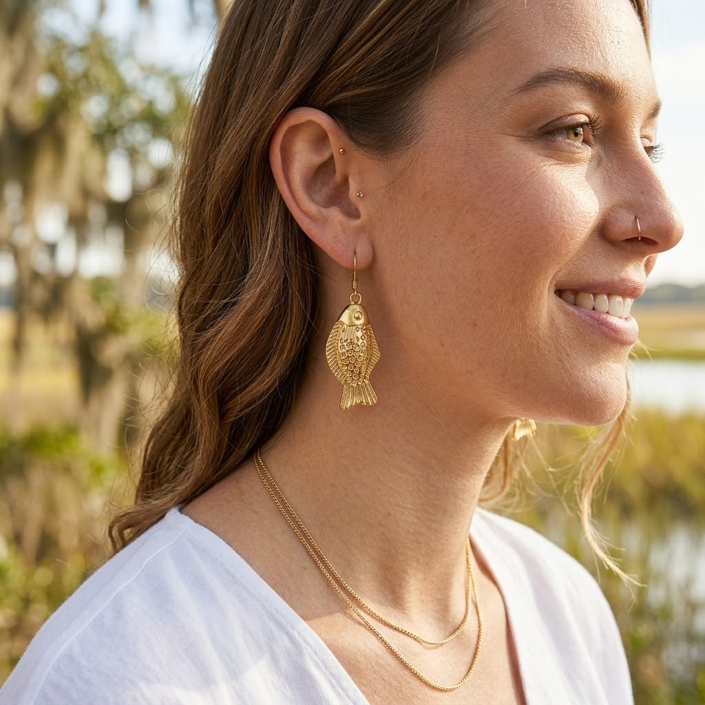 Finished with 14kt gold-filled ear hooks and 18kt gold-filled over brass fish charms, they offer lasting shine and comfortable wear.