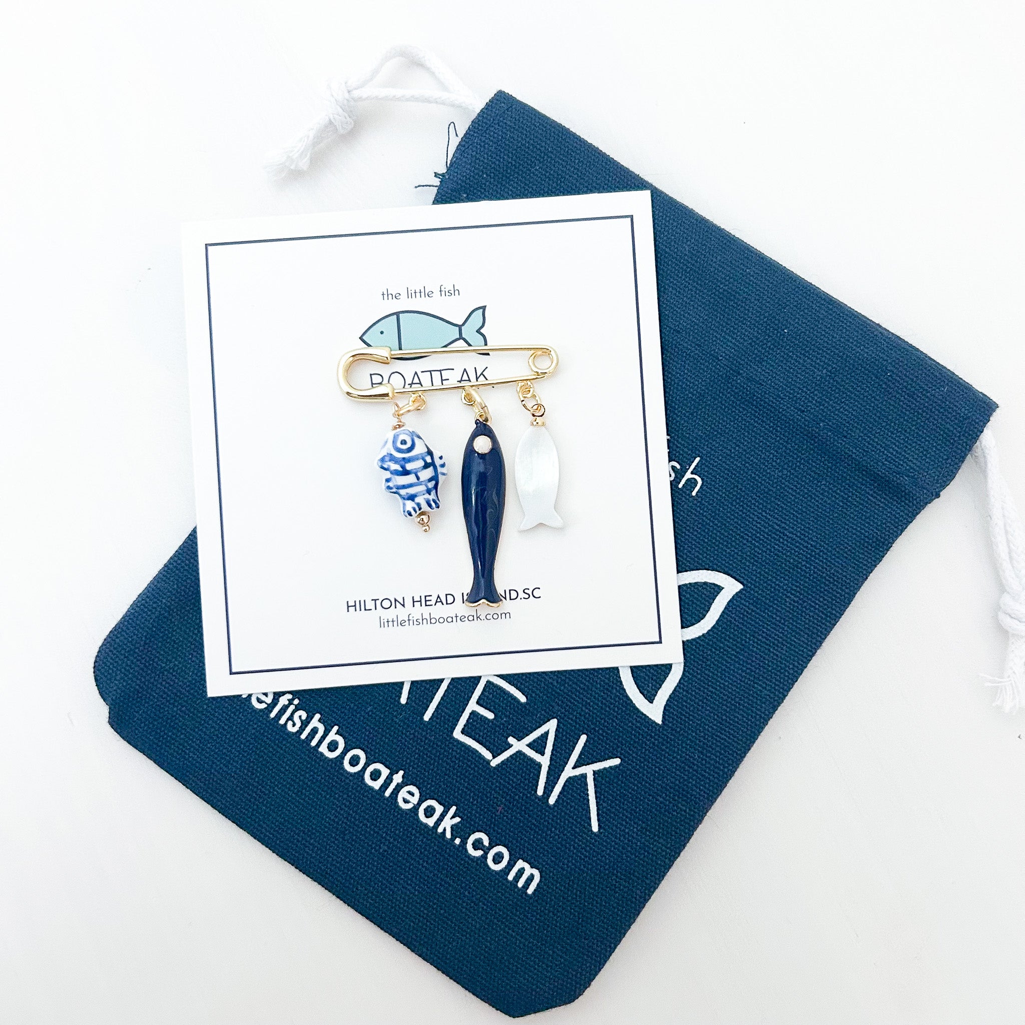 24kt gold filled pin brooch with 18kt gold filled coated navy fish, chinoiserie fish anbd mother of pearl fish