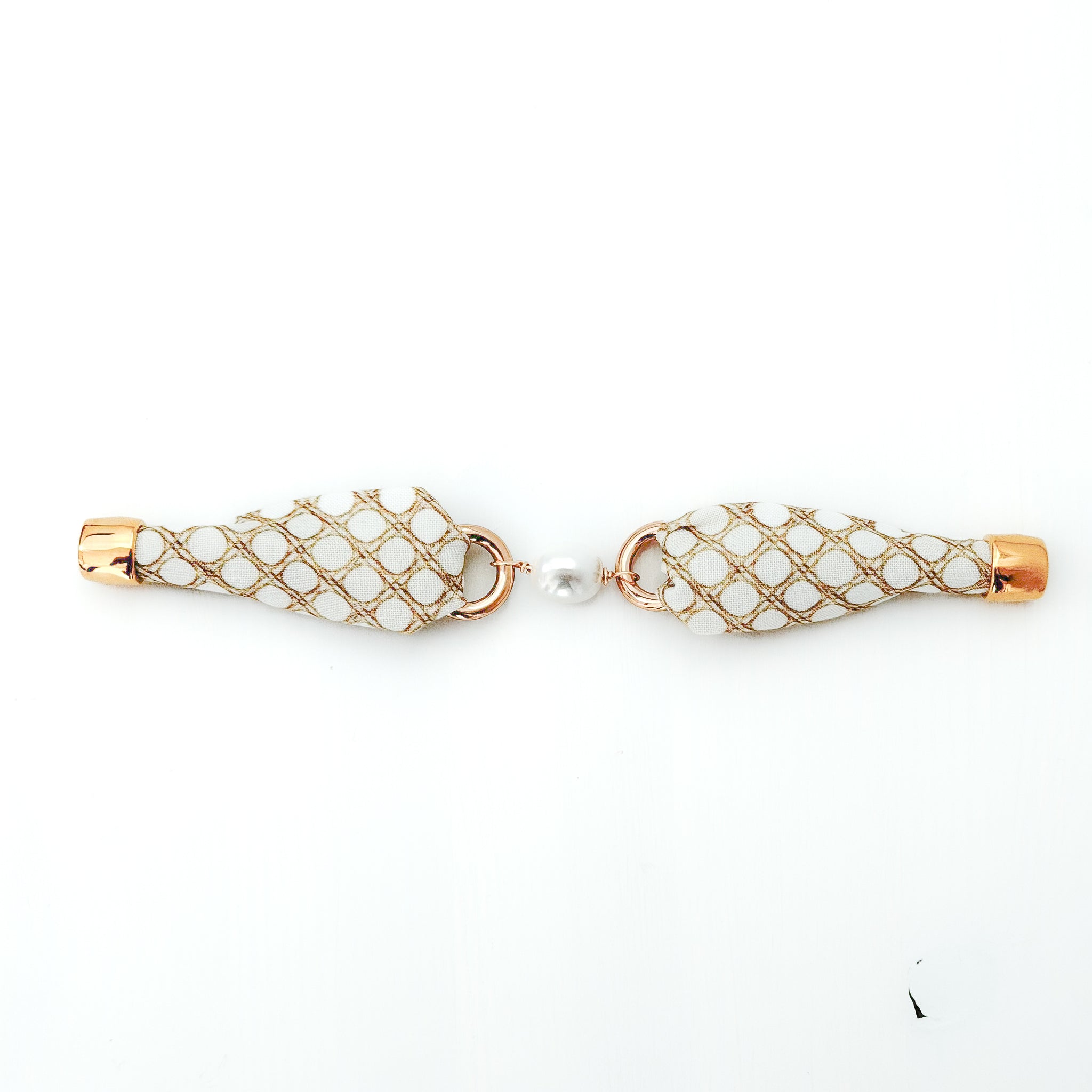 Each bracelet is handcrafted using our custom printed fabric and finished with plated metal rings that highlight a luminous rice pearl centerpiece. The neutral tone makes this cuff an easy everyday accessory while still offering a unique artisan statement.
