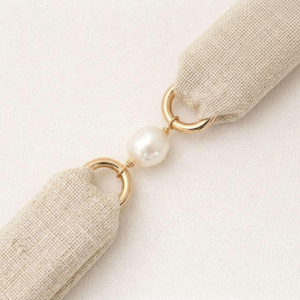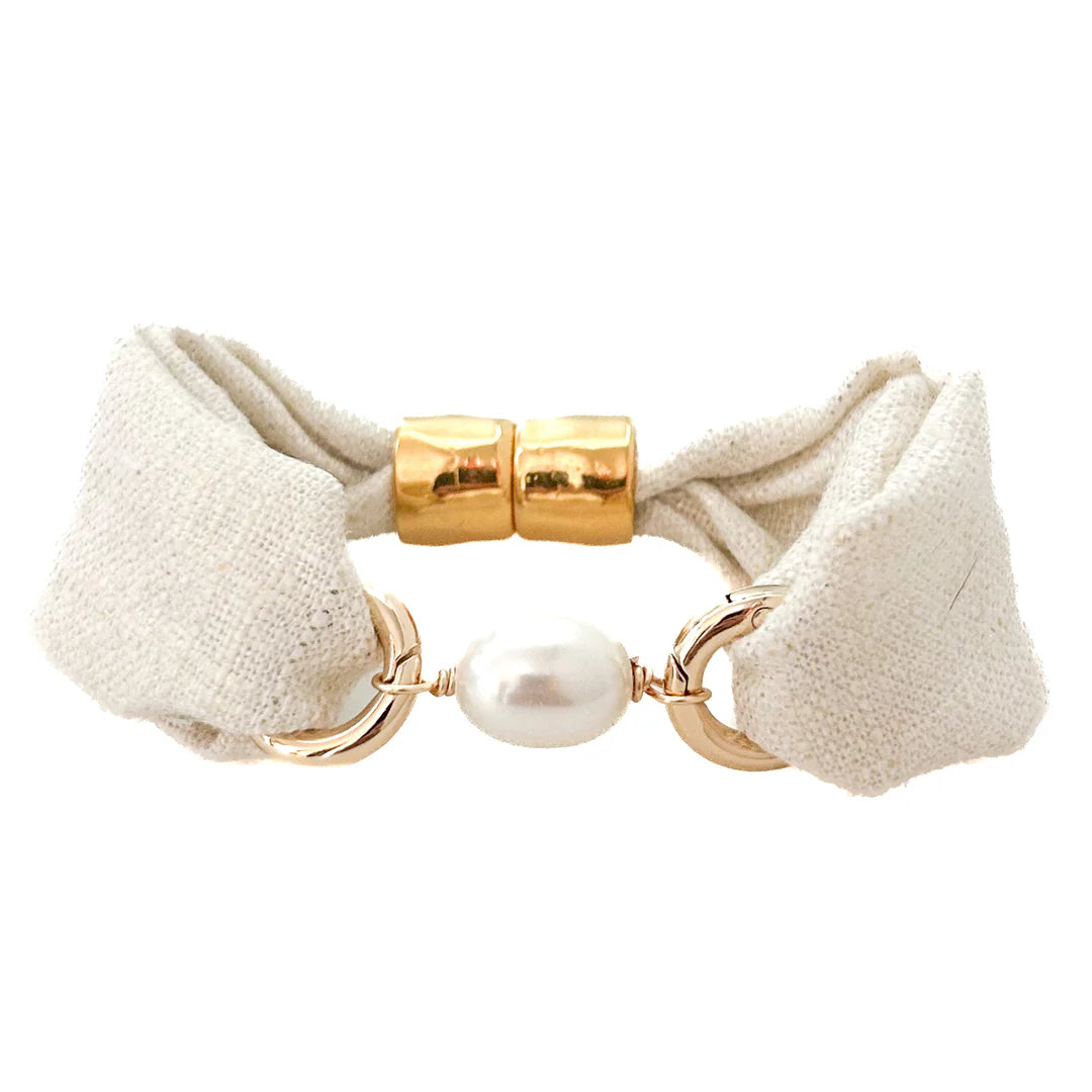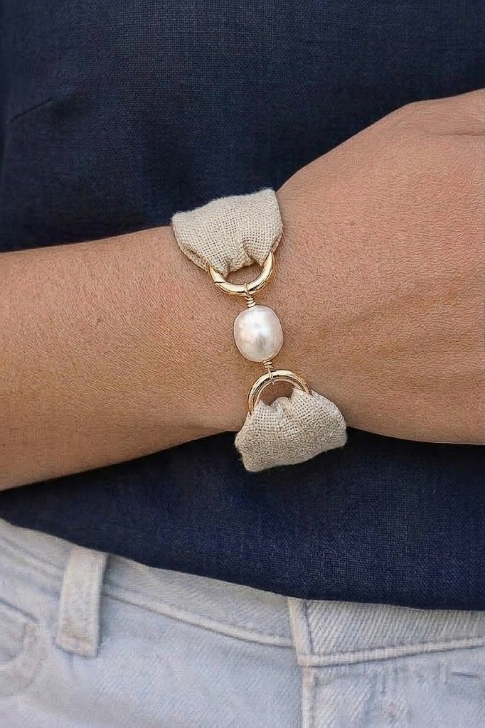 This Crew Cuff bracelet features a beautifully textured natural linen fabric with a subtle gold metallic sheen, giving it a soft glow that catches the light just enough to elevate its coastal simplicity. The fabric wraps around structured cuffs and is connected by polished gold rings and a luminous freshwater pearl, creating a refined balance of texture and shine.