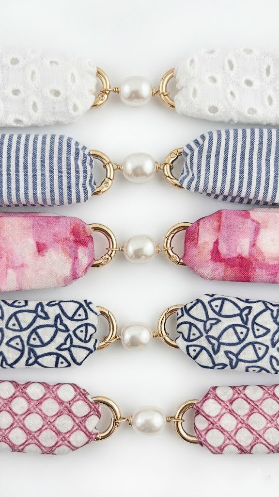 This Crew Cuff bracelet features our custom Hilton Head Island–inspired pink fabric, designed by little fish BOATEAK. The soft pink textile is patterned with a subtle woven motif that reflects the relaxed coastal charm of HHI while adding a playful pop of color.