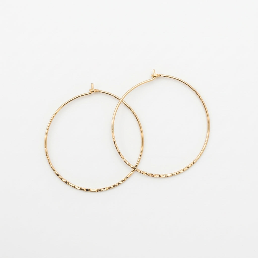 These thin hammered gold hoop earrings offer a timeless design with a subtle textured detail along the bottom edge. Crafted with gold plating, the delicate hoops feature a lightly hammered finish that catches the light beautifully while maintaining a clean, classic look.