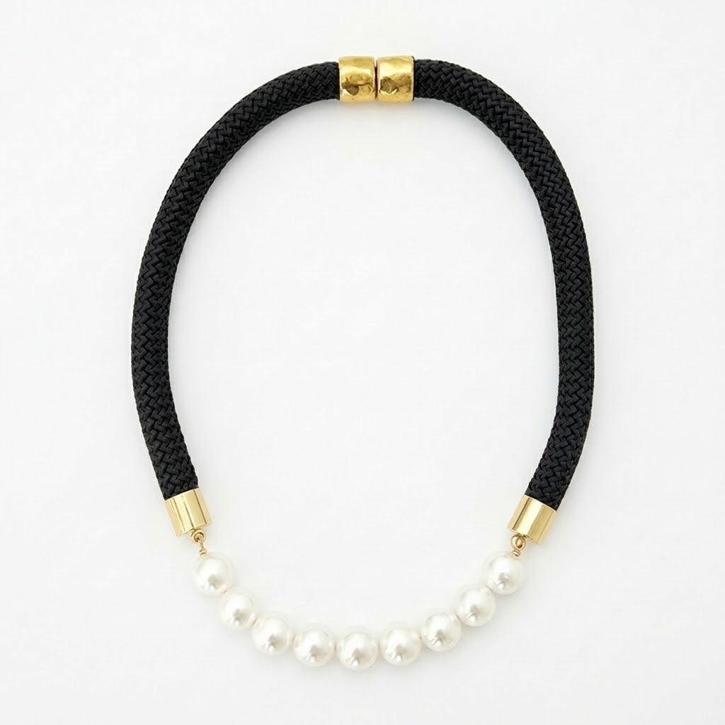 This comfortable, nautical inspired rope necklace features a hand wired round pearl center and plated magnetic closure.