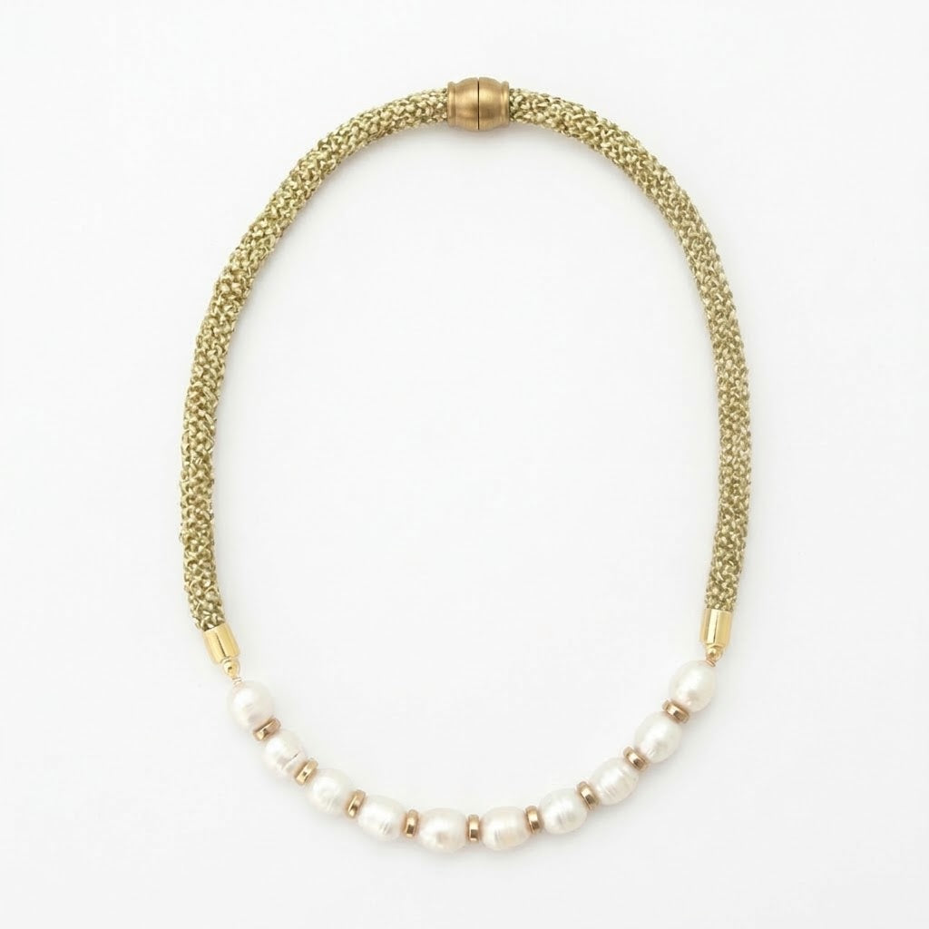 This comfortable, nautical inspired nylon rope necklace features a hand wired pearl accent center and plated magnetic closure.