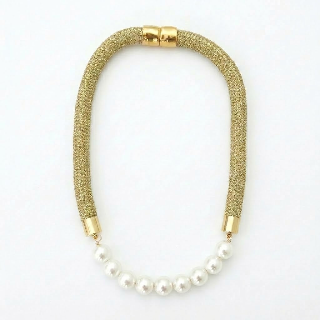 This comfortable, nautical inspired nylon rope necklace features a hand wired pearl accent center and plated magnetic closure.