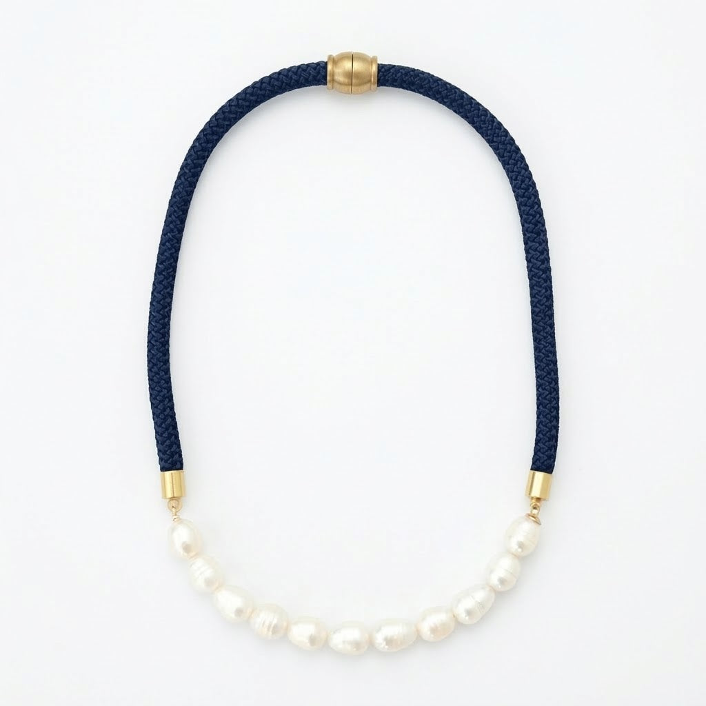 This comfortable, nautical inspired nylon rope necklace features a hand wired pearl accent center and plated magnetic closure.