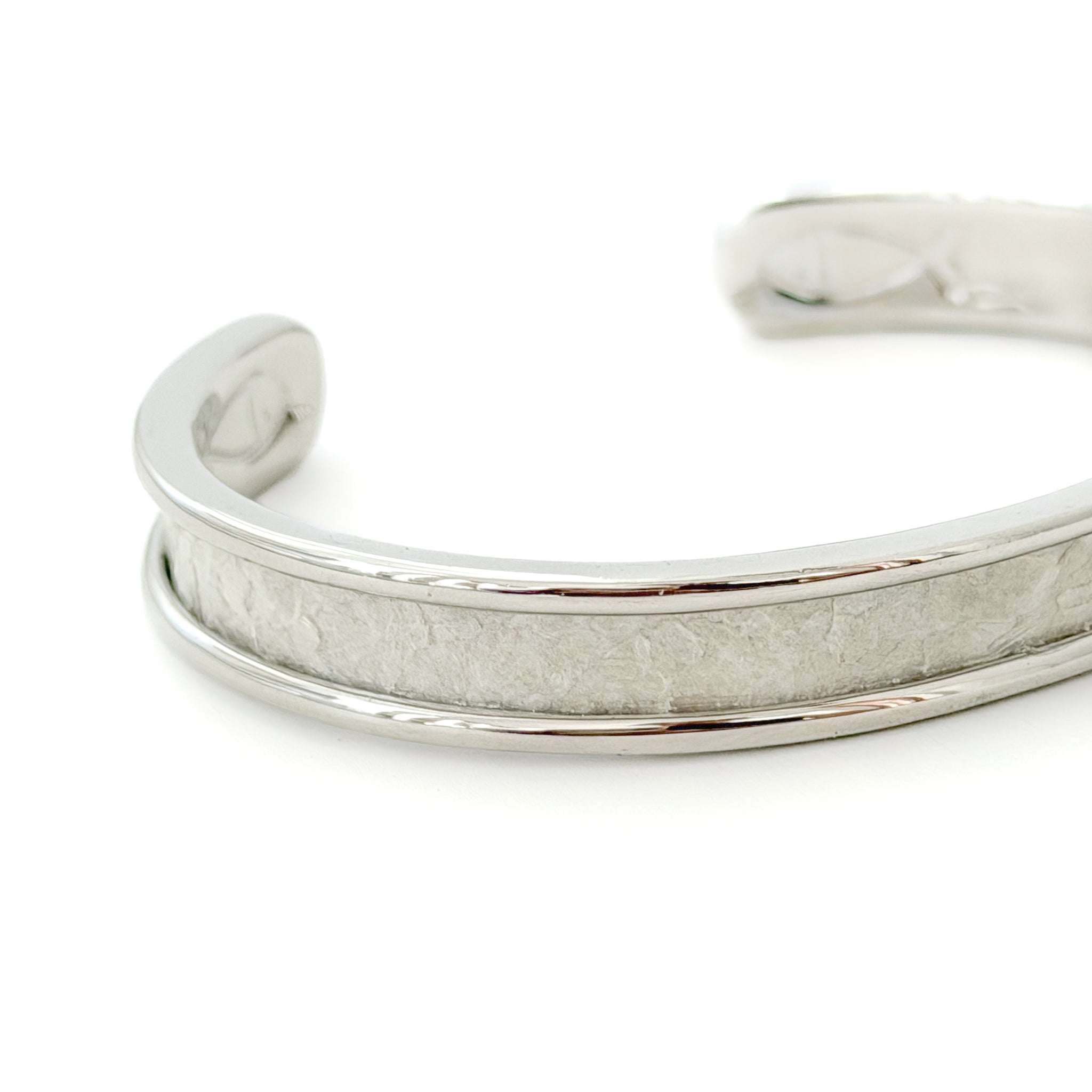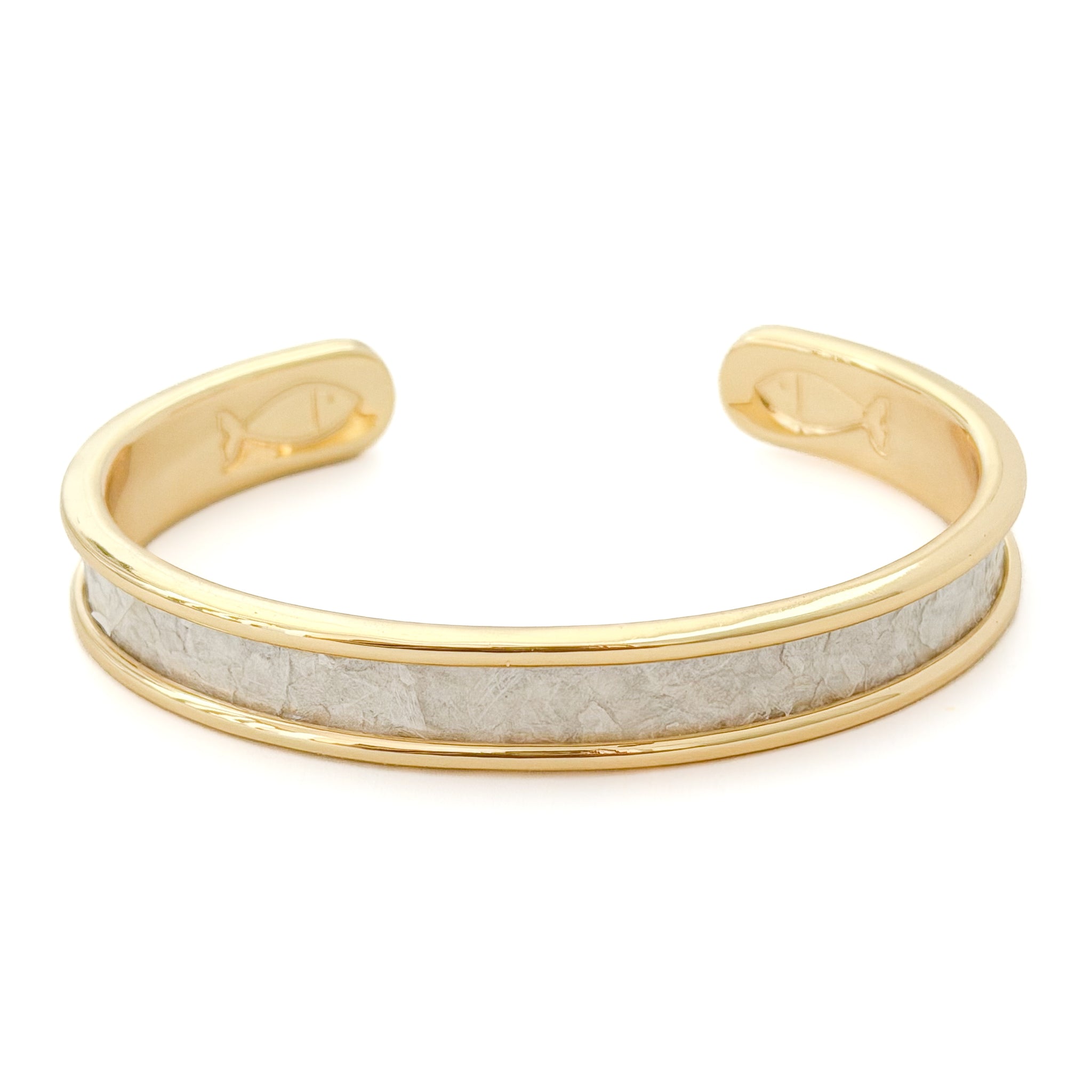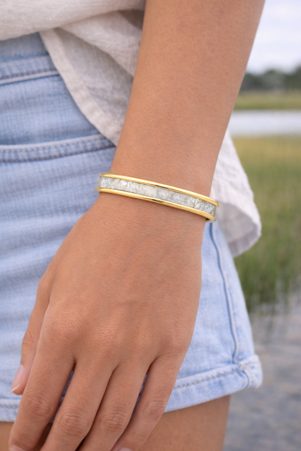 Each bracelet is handcrafted with a sleek gold or silver plated cuff and finished with a carefully cut strip of the textured Mother of Pearl wallpaper, known for its dimensional layers and luminous shell fragments. The result is a piece that reflects light beautifully and evokes the elegance of seaside living.